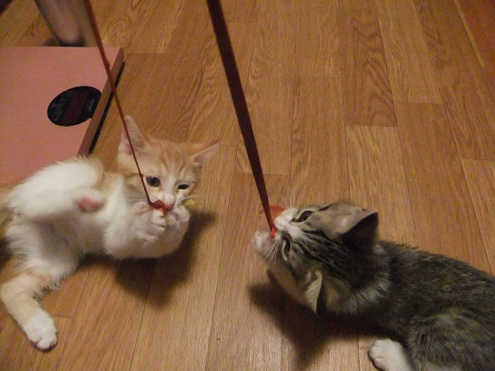 両手に持って2匹をじゃらし、飛びついてくる2匹の爪が手や