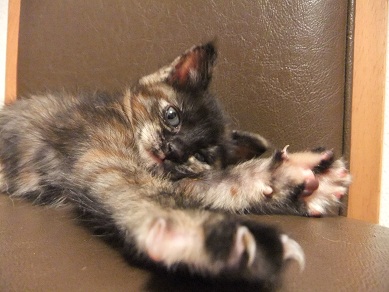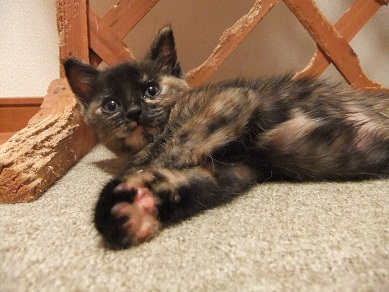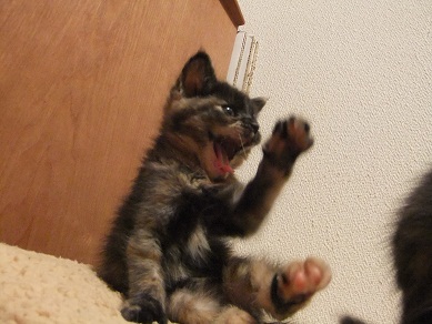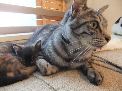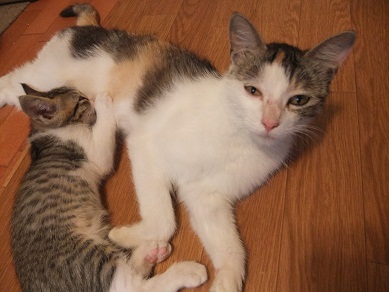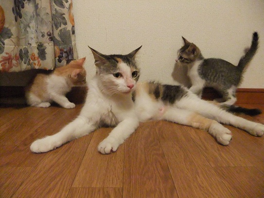 母猫は過酷な環境の中の子育てで、背骨がごつごつになるほどやせ細り、毛もパサパサですが、子猫たちは母猫のおっぱいをおなかいっぱい飲んで愛情いっぱい育てられているので健康そのものです。