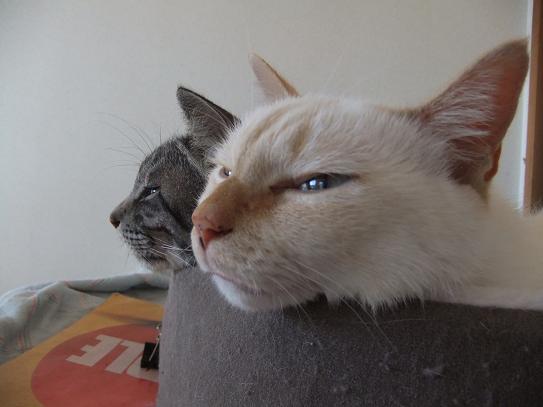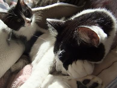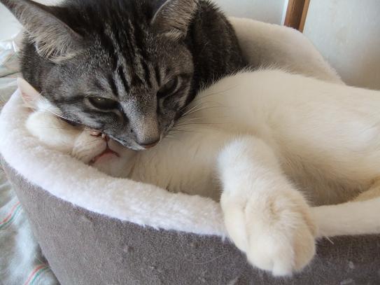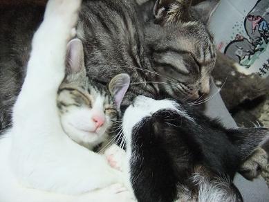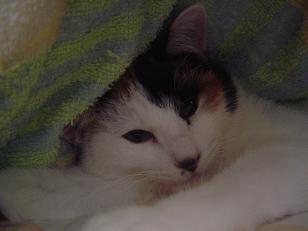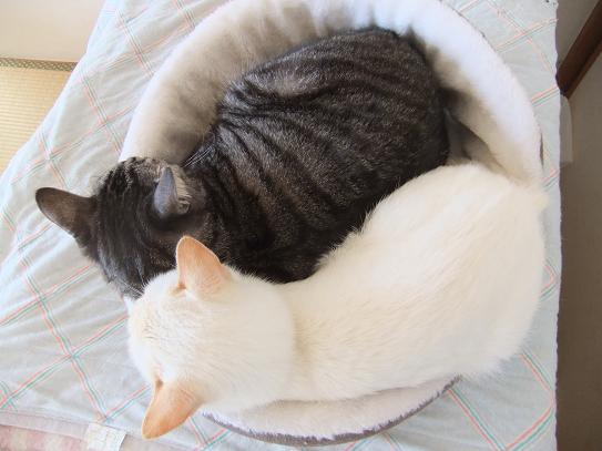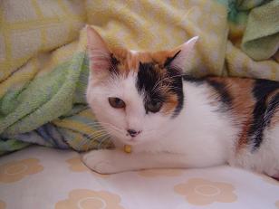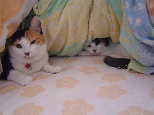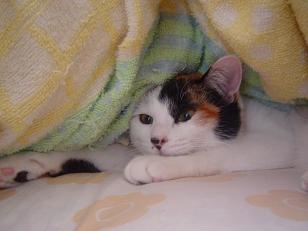 寒くなりました。朝食後、布団をたたもうと したら、あら! 三毛にゃんずがはさまって ました。こたつがあるのに、なぜ? ぬくぬくで出たくないよ-。 眠いよ-。 ボケボケー。 あまりに眠そうで出たくなさそうなので、また 掛け布団を元に戻してしまいました。休みの 日はいいけれど、平日は困るのでこたつに 移動してもらいます。