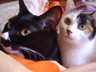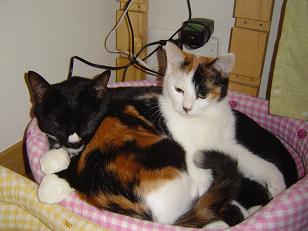 これは何でしょう? よもぎとお兄ちゃんの猫団子。隣に色違いのベッドがあるのにね。 お兄ちゃんの上にどっかり乗ってますが、お兄ちゃんは嬉しそう。 椅子でも一緒。 お布団でも一緒。仲いいね。