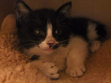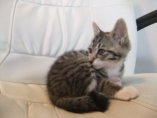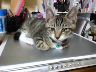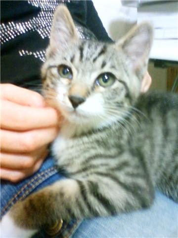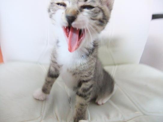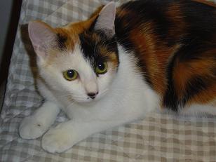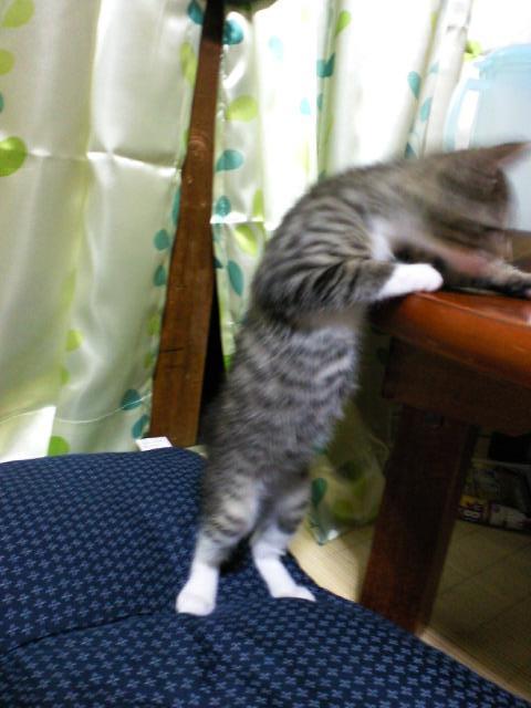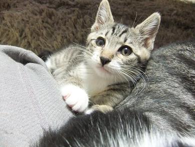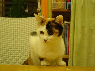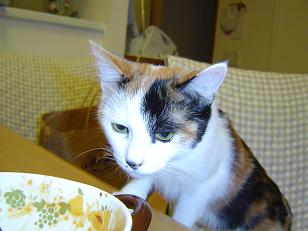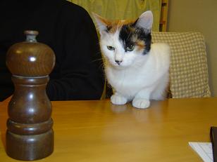 よもぎは椅子大好き。ここに座ってテーブルの上を 見るのは楽しい。できれば、乗りたい。見てなければ 乗っちゃおう♪(娘の小さい時と一緒。子どもは「いけない」 と言われるとしてみたいよう) お父さんの隣がよもぎの席よ、と決めているみたい。 お鼻ヒクヒク、いい匂い。これなあに? (グラタン食べた後。真剣すぎる顔が怖い!) 人間の食べ物に興味津々。だけど、食べちゃダメ なので、しっかりガード。「いけない」「ダメ」というのは 口調でわかるのか、やめます。 でも、テーブルの上に乗りたいなあ。