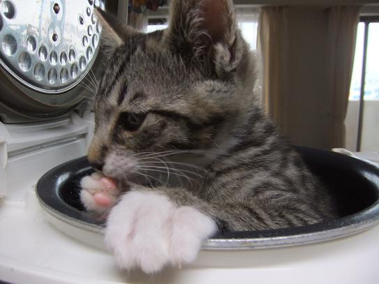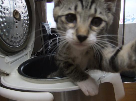 午前中は日の当たる椅子でおねんね 日が動き、「ん?寒い?」と気が付くと レオンにくっついて午後はおねんね 暖かい場所をみつけるのが上手な麦ちゃんが、 遂にこんな穴場?を発見! ご飯を炊いた後の炊飯ジャーです。釜の内側についたオブラート(糊)食べてるし(笑 まるでお風呂のようにくつろいでいますが、、、、今後は蓋開けっぱなし厳禁です!!