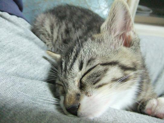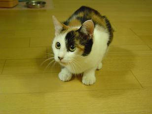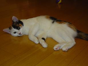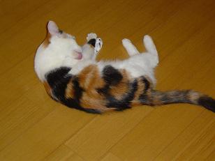 よもぎは、くっきりはっきりした三毛(=^・^=)です。 茶というよりオレンジがかった色と黒と白の コントラストがはっきりしてます。 お腹は真っ白でふんわりしています。つい気持ちいいので ナデナデしてしまいます。よもぎもお腹なでられるのが好き みたいで、なでていると「お腹もどうぞ」とパッタリ倒れます。 肉球はピンクと黒のミックスです。 そして、左目アイラインとぽっちりホクロのような 黒い毛があります。