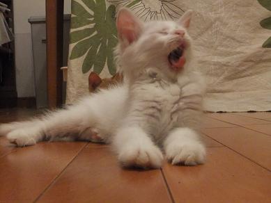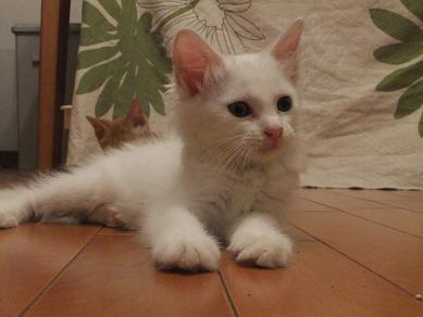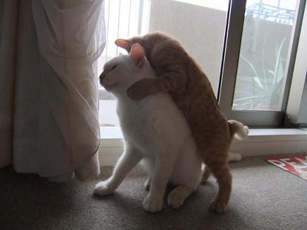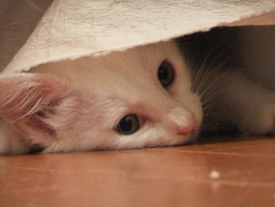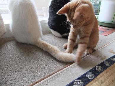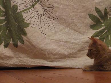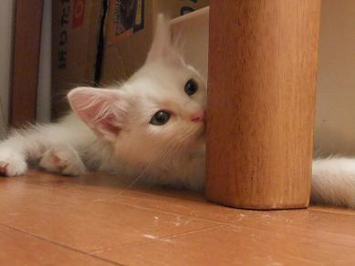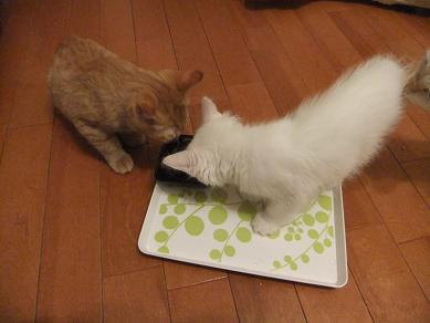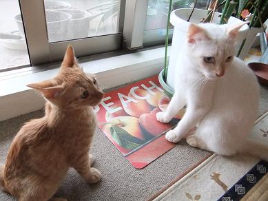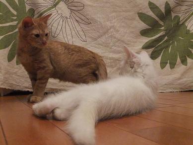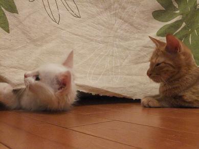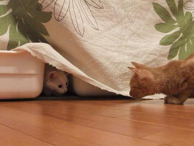 布の向こうに隠れるリリーを、辛抱強く待つ小茶。時にルールルlルーと呼びかけながら。。 なのに、せっかく顔を出してくれたときには、寝ちゃってるし(笑 生後3ヶ月の小茶と生後2.5ヶ月位のリリーはあっという間に仲良しこよし 子猫フードがあまり好きじゃなかったのに、 リリーが一緒だと競うようによく食べるようになった小茶。 かくれんぼ、おっかけっこ、プロレスごっこ。にぎやかになってきました。