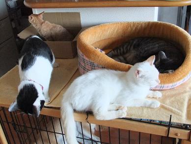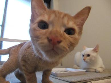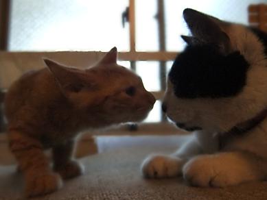 人間大好きな子茶は、猫も大好き 先輩猫への挨拶もとっても上手で 鼻先をチョンチョンと突き合せた後は、神妙な顔で体の匂いを嗅がれていました。 おかげですぐに猫社会に仲間入りです