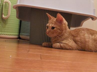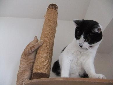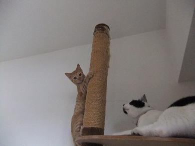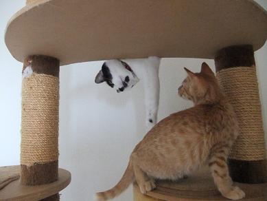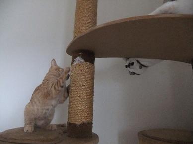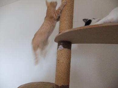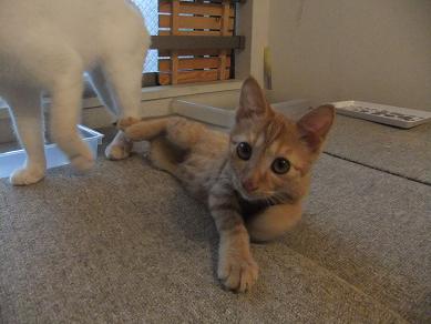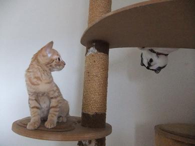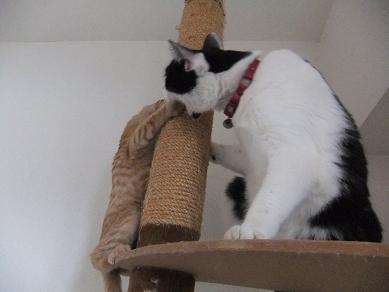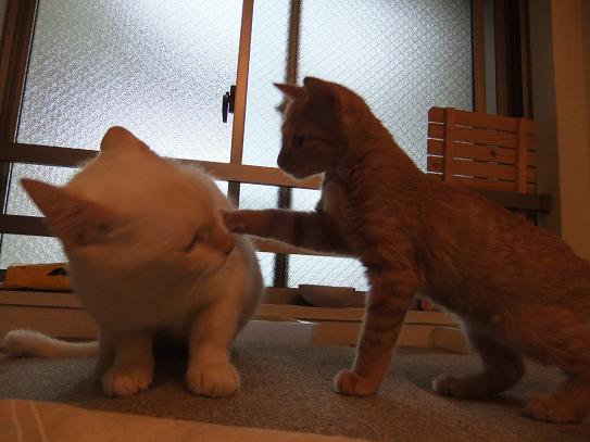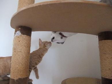 遊びたくてうずうずの子茶 誰かボクと遊んで~ しきりにゴエモンの気を引こうとしてます 勇気を出して、尻尾にタッチ でも、怒られちゃったね と、思ったら 遊んでもらえそうだよ 友情成立 追いかけっこスタート!