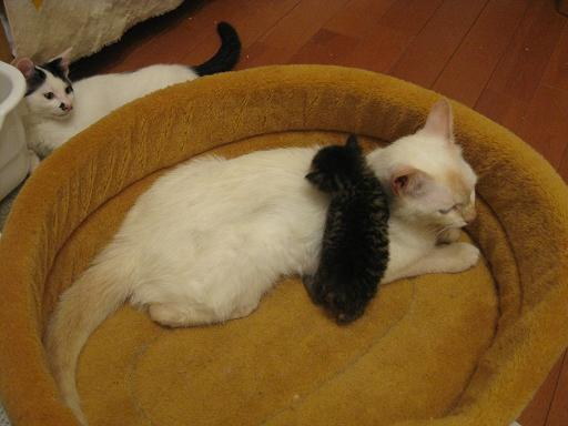 下痢中は夏の面倒をみたがらなかったみるくが、今はおっぱいをあげ、優しく舐めてあげるようになりました。