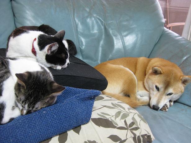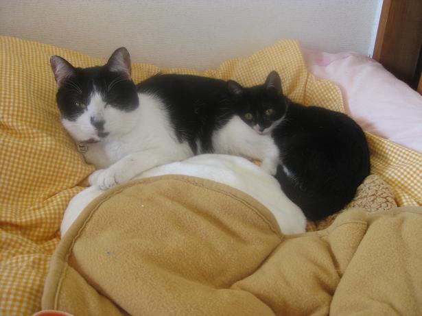 ひざの上は冬の人気№1スポット。座ったとたん、つくしとゴエモンが乗っかってきます。