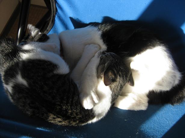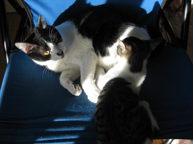 つくしは短い尻尾をツンとあげて、甘えた声で近づき、何とか相手をしてもらおうと、必死に擦り寄るのですが、あまりに真正面からの直球なアプローチすぎるのか、2匹ともいささか当惑気味です(笑。