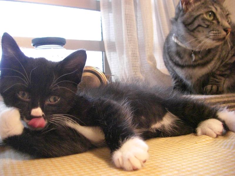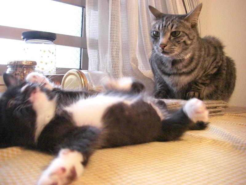 兄ちゃん猫達になんとか遊んでもらおうと、前足でちょんちょんしたり、背中や足にカプリと噛みついたり。