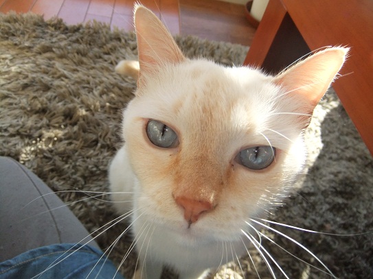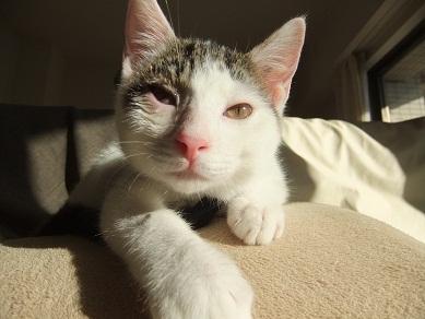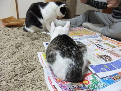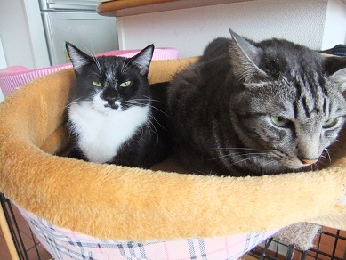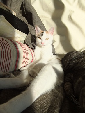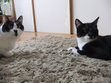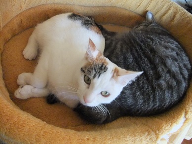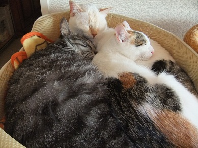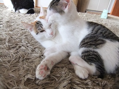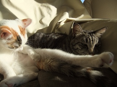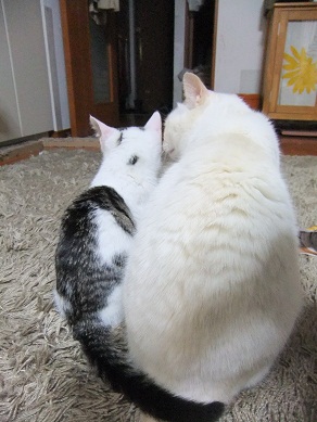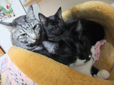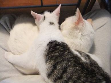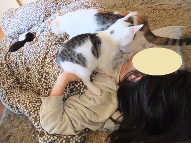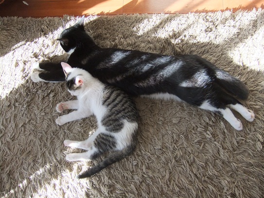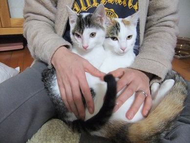 日差しを浴びて、なんとも気持ち良さげ 日中は、見事にみんなが日向に集合 それが夕方になると、膝の争奪戦が開始 熾烈なセンター争いの結果、今回はWセンター 甘えん坊主かぶちゃんと 甘えた姫かえちゃん