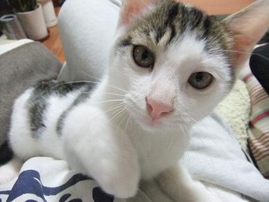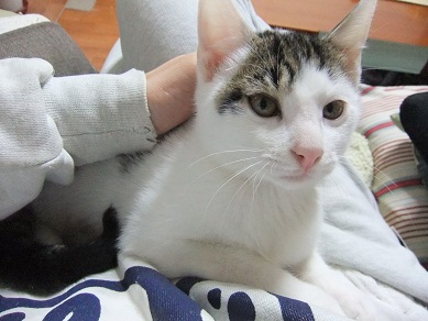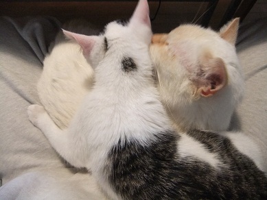子猫ズにとって優しい姉的存在のみるく 膝の上でのくつろぎタイムをジャマされてても怒りません あれれ、なんか怒ってる??