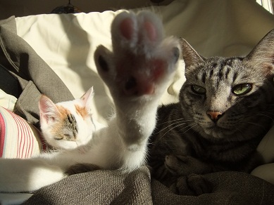 子猫ズにとって、レオン=ボス、みるく=姉ちゃん じゃ、ゴエモンは? とりあえず、目上の者とは思われていない様子 精神年齢が子供のまま止まってるからなぁ(笑 前足の爪が引っかかって、地味に困ってるの図
