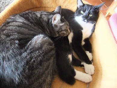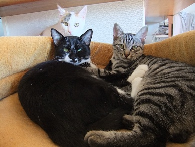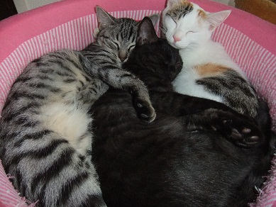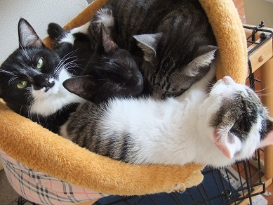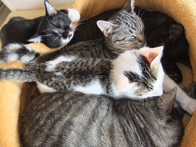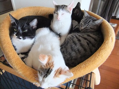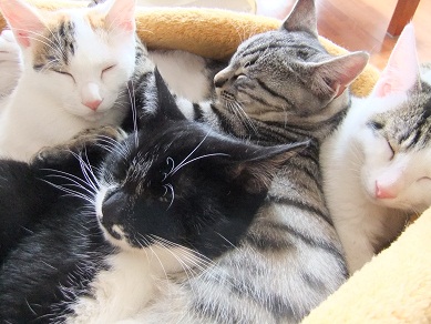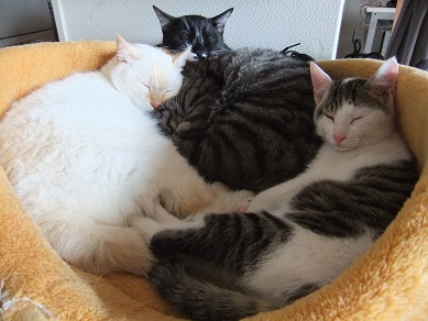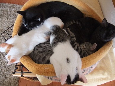 適度な距離をとってくつろいでいた猫たちですが 寒くなってきて密着度が急に高まりました