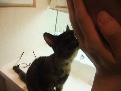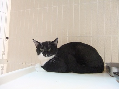 シャワーも、浴槽のふたの上で箱座り見学