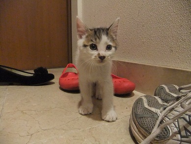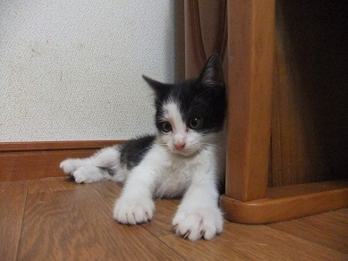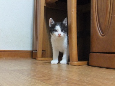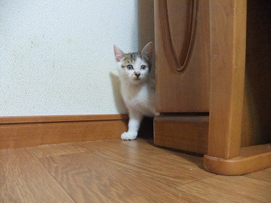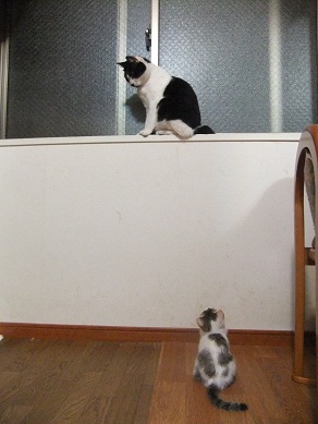 それがちょっとずつ好奇心がでてきて 緊張感も薄らいできた 近づいてみようかニャ もちょっと近づいてみようかニャ