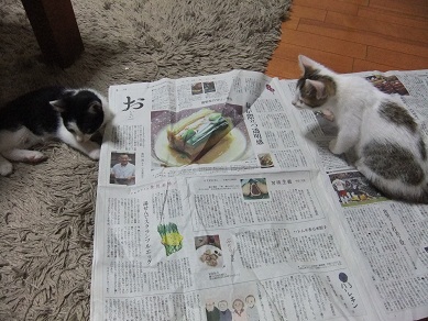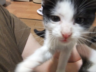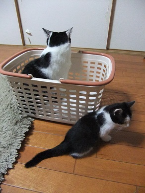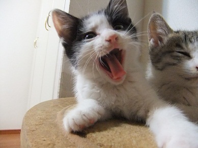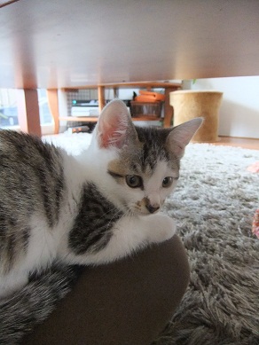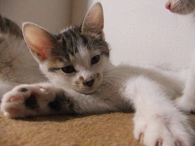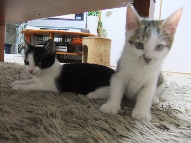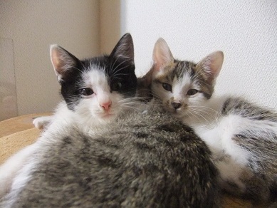 口の周りがうっすら茶色くて、カールおじさんみたいで 愛嬌たっぷりな惑ちゃん 鼻も肉球もきれいなピンク、 左右不均等なハチワレも、おしゃれ~な月ちゃん 2匹とも、のんびりしてて甘えん坊な男の子です♪