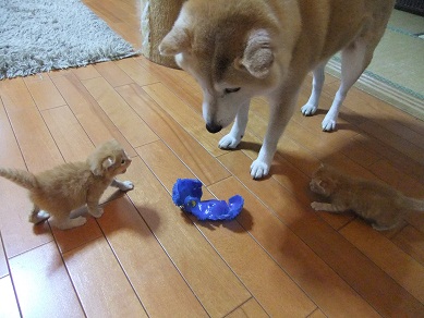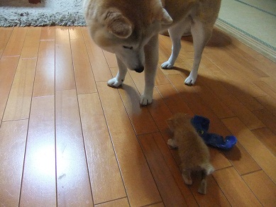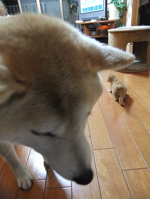 ヨチヨチ歩き回る子猫に、タジタジな柴犬