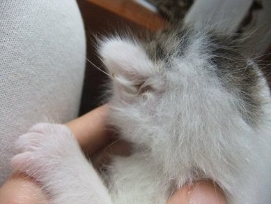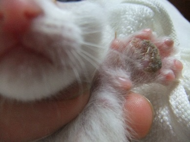 耳の後ろのベタベタした傷 左前足の肉球(掌球)と 左前足の肉球(手根球)の腫れ カビ?ダニ?と不安をかかえ病院へ どちらも消毒して軟膏塗っておけば,すぐに治るとの診断 心配いらないって。良かったね♪