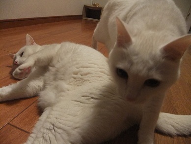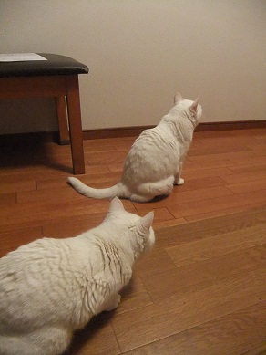 一晩たった今も食欲は半分以下、警戒MAXの2匹に対し