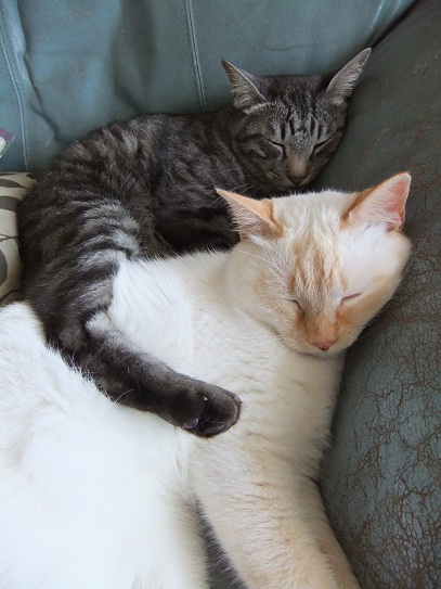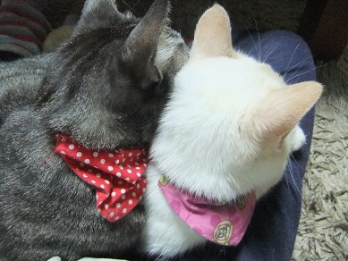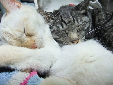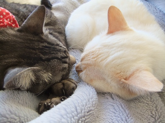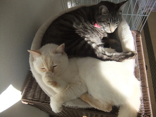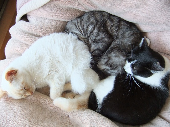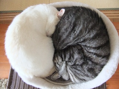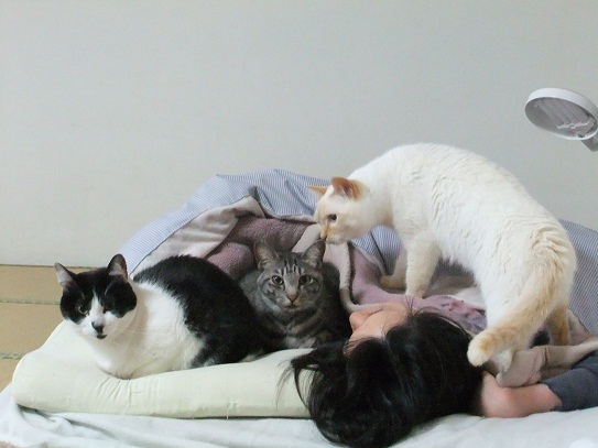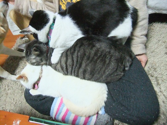 昨日の15℃から一転、雪まで降った今日は、 猫同士で暖をとりあい 人の膝の上に積み重なり 布団の場所取りで大騒ぎ