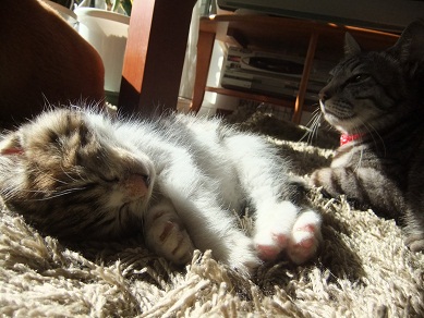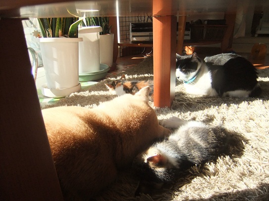 背中を暖めるロス 日差しの中に入るサン 股を殺菌する?(笑)タク 思い思いに日なたを満喫 まったり日光浴の後はお遊戯タイムです