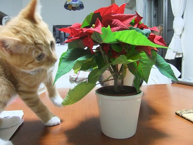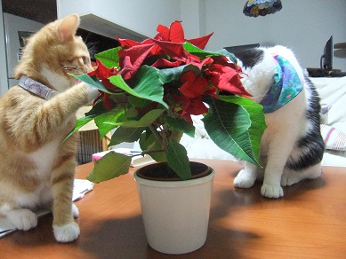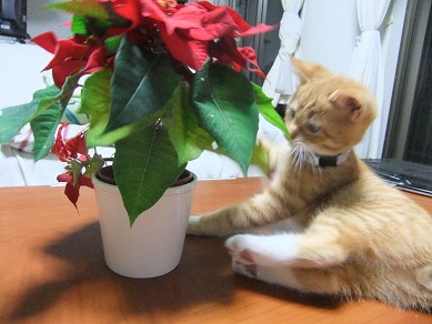 一気にクリスマス気分になるポインセチア 新し物好きの2匹がすぐに集合 引っ張る&齧るという間違った鑑賞法で楽しむ、まろん 一方、画びょう取りに夢中な小野くん 正直、どっちも止めて欲しいなぁ^^;