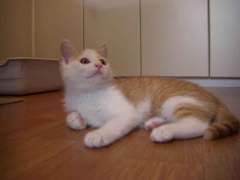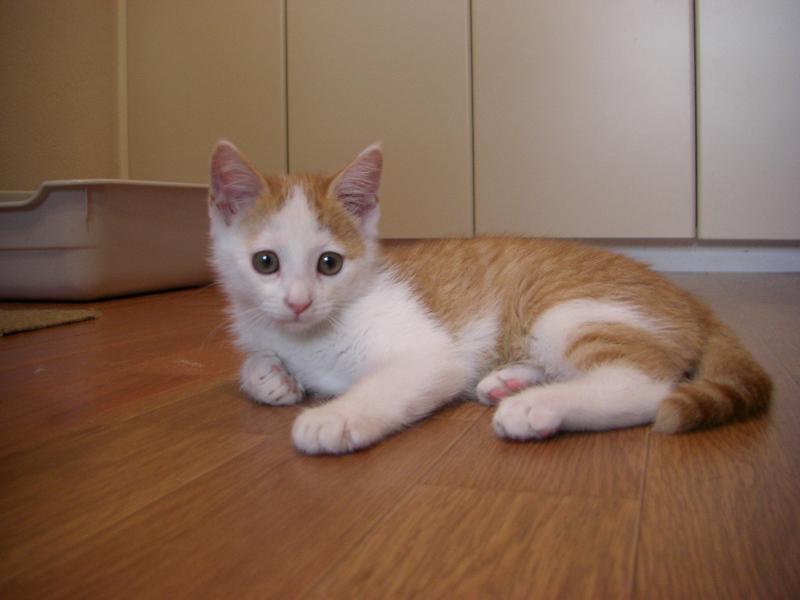 先輩ボラさんのところに持ち込まれました。 初めこそビビリン坊ですが、慣れてしまえばアホみたいによく遊びます。 先輩にゃんこにも自分から積極的に近づいて遊んでちょーと誘い、猫パンチを受けても、すかさずヘソ天降伏ポーズをとるお利口さんです。 泣き顔のとぼけた表情がなんともいえず可愛い「プリン」、まだ聞かせてくれない泣き声は、どんななのかなぁ。