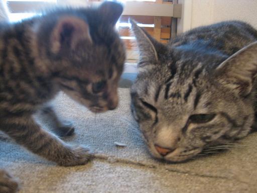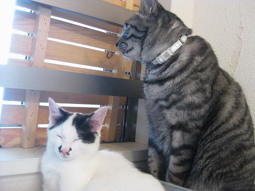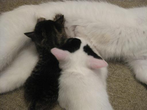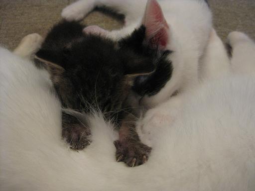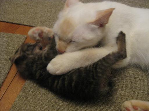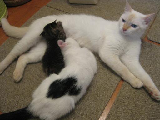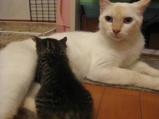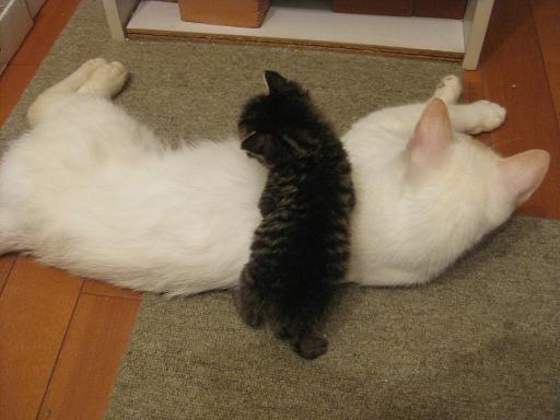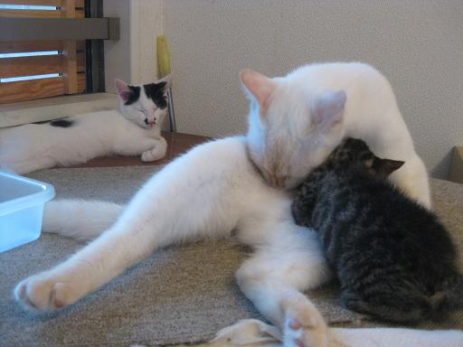 下痢中は夏の面倒をみたがらなかったみるくが、今はおっぱいをあげ、優しく舐めてあげるようになりました。