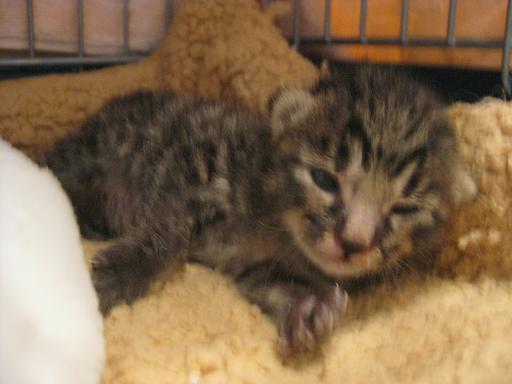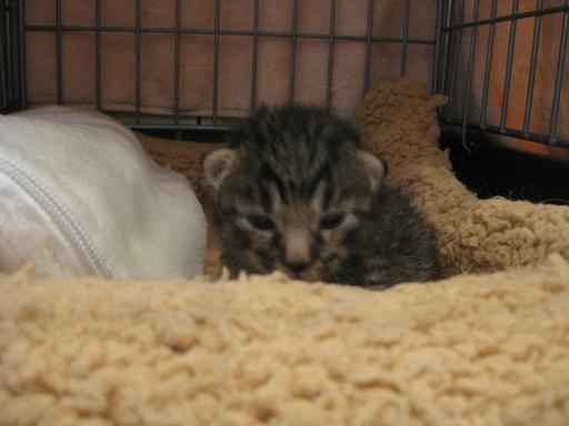 子猫用ミルクを針の無い注射器で飲ませた後は、温かく暗いケージの中でおねんねです。